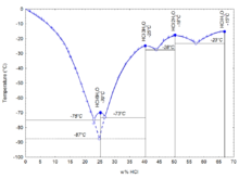 如下圖所示,鹽酸共有四個(gè)結(jié)晶的共熔點(diǎn),分別對應(yīng)四種晶體:68%(HCl的質(zhì)量分?jǐn)?shù),下同)時(shí)的HCl·H2O、51%時(shí)的HCl·2H2O、41%時(shí)的HCl·3H2O和25%時(shí)的HCl·6H2O。另外在24.8%時(shí)還有一種亞穩(wěn)的HCl·3H2O生成。